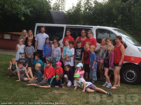 Die DLRG Berkheim lud am 11.08.2015 zum Kinderferienprogramm des Stadtjugendrings Esslingen ein. 22 Kinder zwischen sechs und zwölf Jahren kamen pünktlich und sichtlich aufgeregt an der Rettungswachstation auf dem Gelände des Freibades in Berkheim mit dem Bus an. 4 ehrenamtliche Helfer der DLRG Ortsgruppe Berkheim begrüßten die Kinder und Ihre Betreuer. Alle Teilnehmer bekamen zuerst einen Einblick in die Tätigkeit des Wasserrettungsdienstes und die Aufgaben der DLRG. Im Schulungsraum wurden die Kinder über die Gefahren im und am Wasser aufgeklärt. Anschließend ging’s ins kühle Nass. Besonders großen Anklang fanden die Spiele und Übungen mit dem Rettungswurfsack und dem Gurtretter. Danach ging´s noch in die Sprunggr ... Mehr erfahren