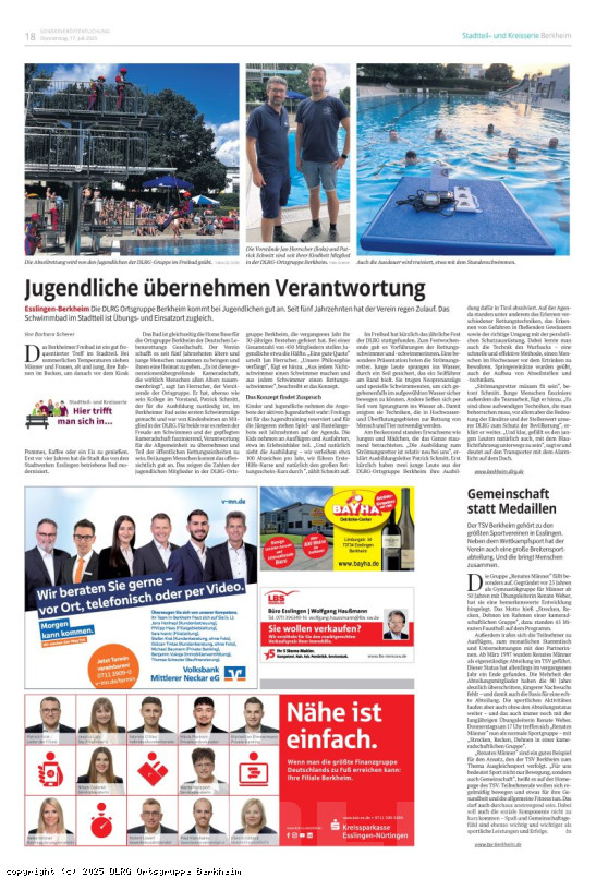 Die DLRG Ortsgruppe Berkheim kommt bei Jugendlichen gut an. Seit fünf Jahrzehnten hat der Verein regen Zulauf. Das Schwimmbad im Stadtteil ist Übungs- und Einsatzort zugleich. Das Berkheimer Freibad ist ein gut fre-quentierter Treff im Stadtteil. Bei sommerlichen Temperaturen ziehen Männer und Frauen, alt und jung, ihre Bah-nen im Becken, um danach vor dem Kiosk Pommes, Kaffee oder ein Eis zu genießen. Erst vor vier Jahren hat die Stadt das von den Stadtwerken Esslingen betriebene Bad modernisiert. . Das Bad ist gleichzeitig die Home Base für die Ortsgruppe Berkheim der Deutschen Lebensrettungs-Gesellschaft. Der Verein schafft es seit fünf Jahrzehnten ältere und junge Menschen zusammen zu bringen und ihnen eine Heimat zu geben. „Es ist diese generationenübergreifende Kameradsch ... Mehr erfahren